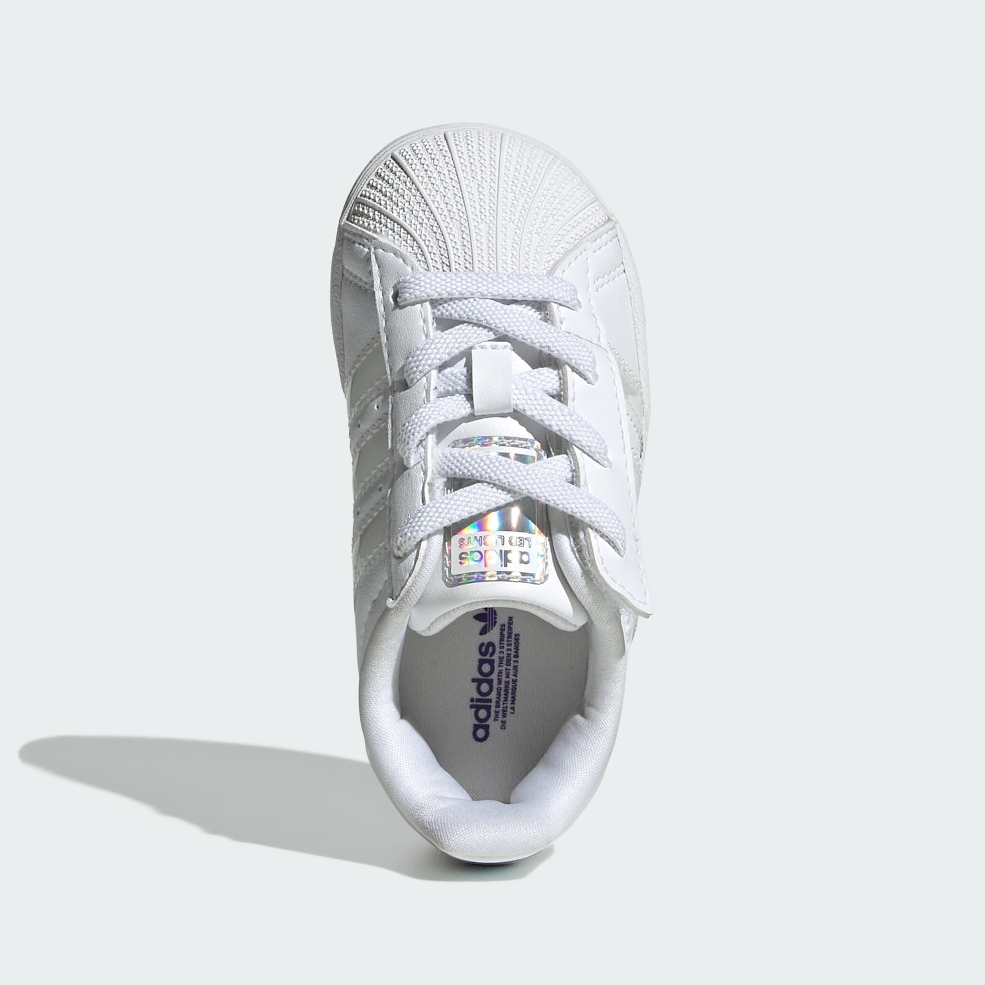 El calzado adidas Superstar debutó en la cancha de básquet antes de dominar las calles durante décadas. Este par para bebés mantiene los detalles emblemáticos que lo convirtieron en un clásico, como la punta clásica de caucho con relieve y el exterior de piel. A los más pequeños les encantarán los efectos de luces de ecualización integrados en las 3 Franjas. Cambia entre tres efectos diferentes o actívalos o desactívalos pulsando un botón situado en el lateral del calzado.