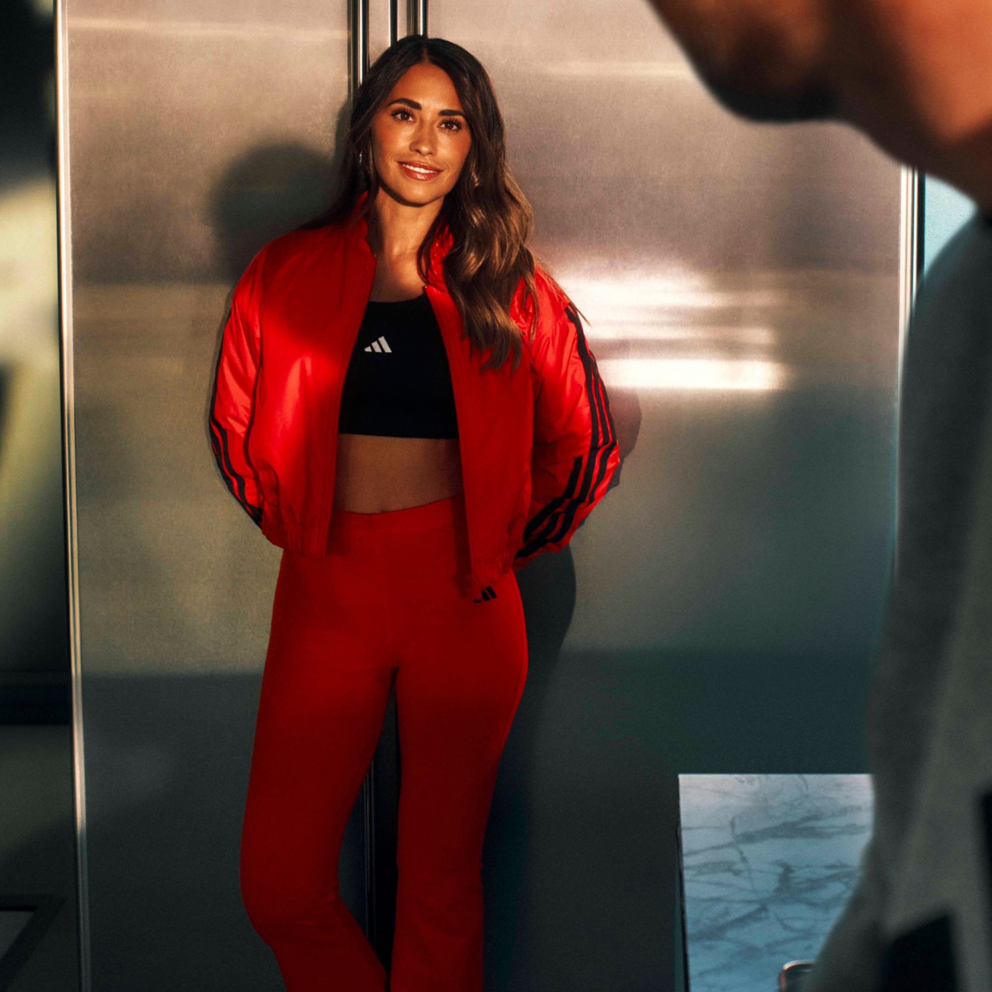 A close-up view of a person's hand wearing a red and black striped sleeve, with a black and white logo visible on the sleeve.