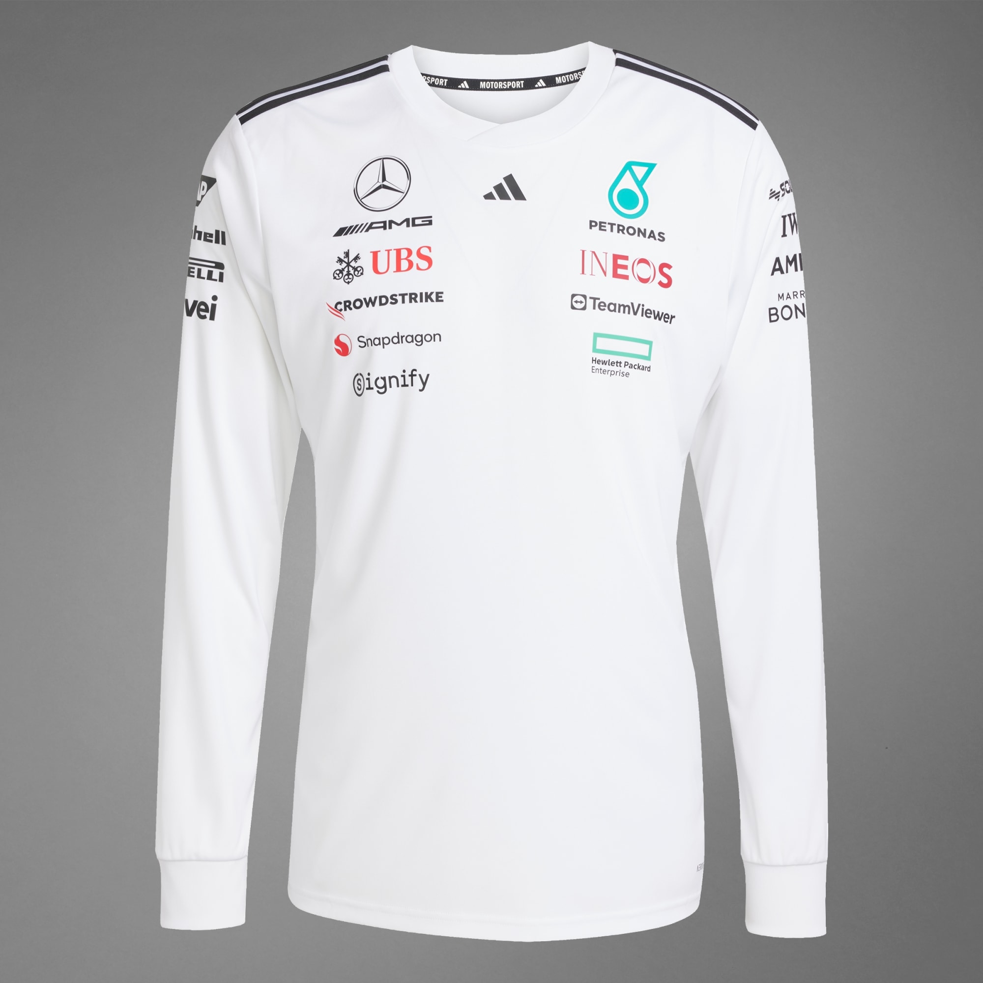 Luce y siéntete listo para tomar el control con esta playera de manga larga de adidas. Diseñada al igual que las que se usan el día de la carrera, esta playera incorpora tecnología AEROREADY para controlar la humedad, proporcionando un rendimiento excelente y una comodidad superior. Los logos de Mercedes - AMG PETRONAS F1 Team y los logos del patrocinador le dan un look auténtico, mientras que las 3 Franjas en los hombros y el logo de las 3 Barras en el pecho le ponen el sello distintivo de adidas. Este producto está hecho con materiales 100 % reciclados. Utilizando materiales reciclados disminuimos los residuos, nuestra dependencia de los recursos finitos y la huella que generan los productos que fabricamos.