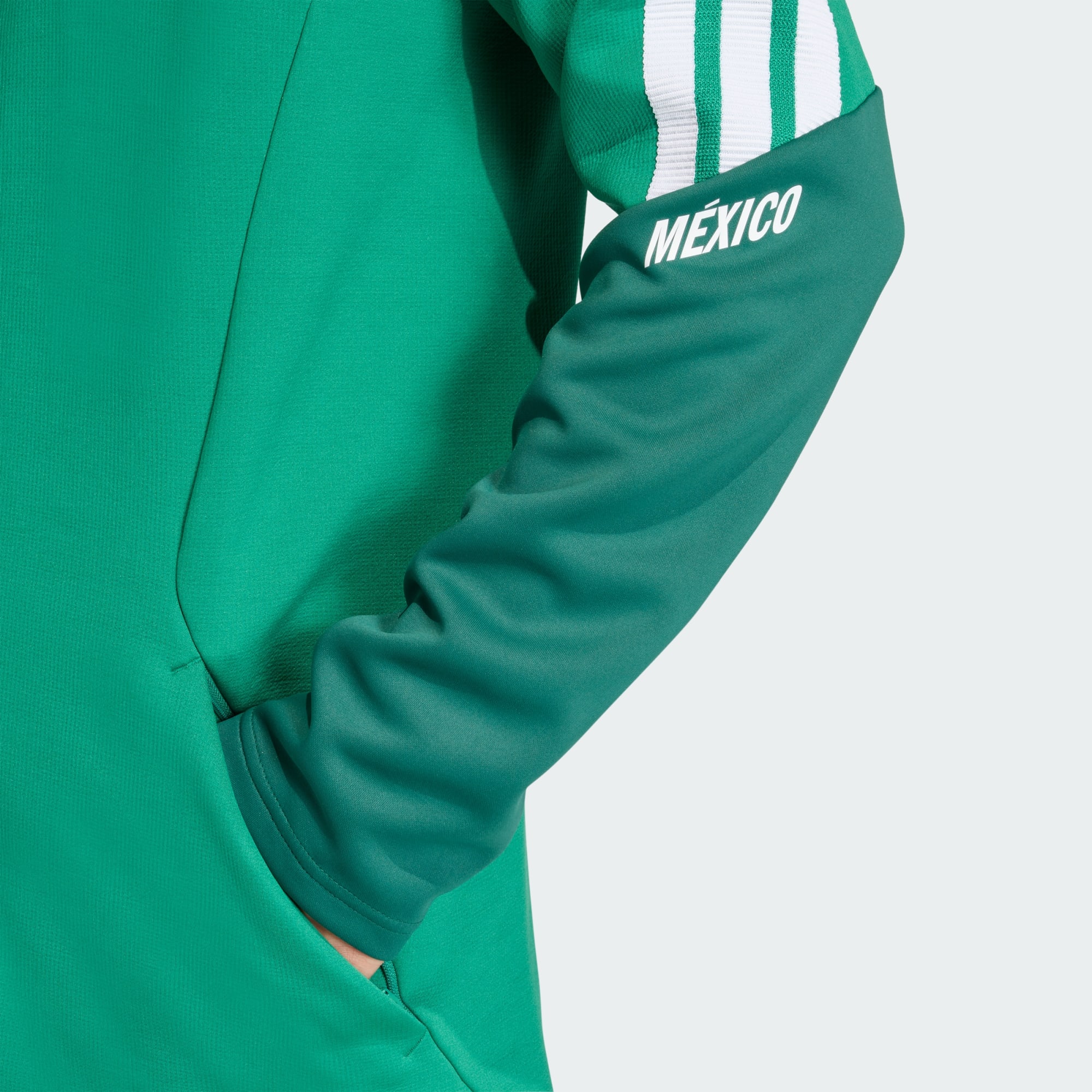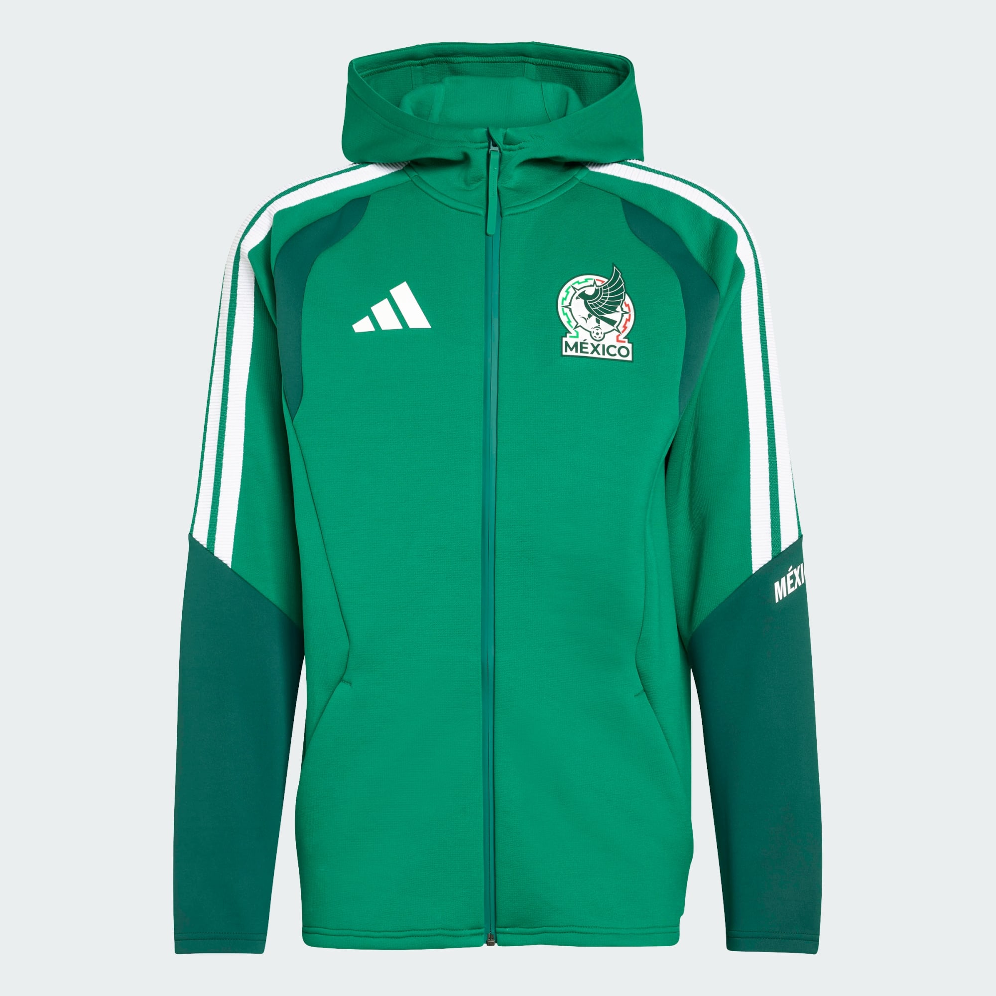Inspirada en los vibrantes colores del uniforme local, la Sudadera con Gorro Tiro Pro Selección Nacional de México 26 te conecta a la perfección con el rico patrimonio de fútbol de la nación. Fabricada con materiales premium, promete comodidad y estilo, convirtiéndola en una prenda esencial para el uso diario. Confeccionada para la vida fuera de la cancha, la sudadera con gorro ofrece un corte ajustado que se adapta a tu cuerpo, para que te muevas con facilidad y estilo. El cierre frontal central facilita su uso, mientras que el logo adidas de silicona texturizada y las 3 franjas de cinta acanalada le añaden un toque adidas distintivo. Tanto si vas a una salida informal como a una sesión de entrenamiento, esta es tu prenda imprescindible para una mezcla de tradición y modernidad. Adopta el espíritu del fútbol con adidas y convierte esta sudadera con gorro en una prenda esencial de tu guardarropa.