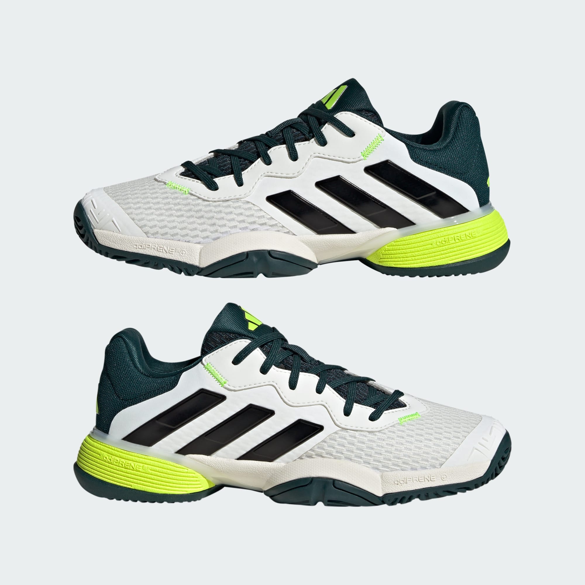 Disfruta al máximo la emoción del próximo punto. Estos tenis adidas para jóvenes para jugar tenis se encargan del resto. El exterior ligero tiene un forro suave que aporta gran comodidad y sujeción en cada rally, mientras que la amortiguación Adiprene+ absorbe los impactos y te ofrece una pisada más cómoda. La suela que no deja marcas te mantiene firme sin dañar la cancha, para que nada te distraiga en los momentos decisivos del partido. Este producto contiene al menos un 20% de material reciclado. Utilizando materiales reciclados reducimos el desperdicio, nuestra dependencia de los recursos finitos y la huella que generan los productos que fabricamos.