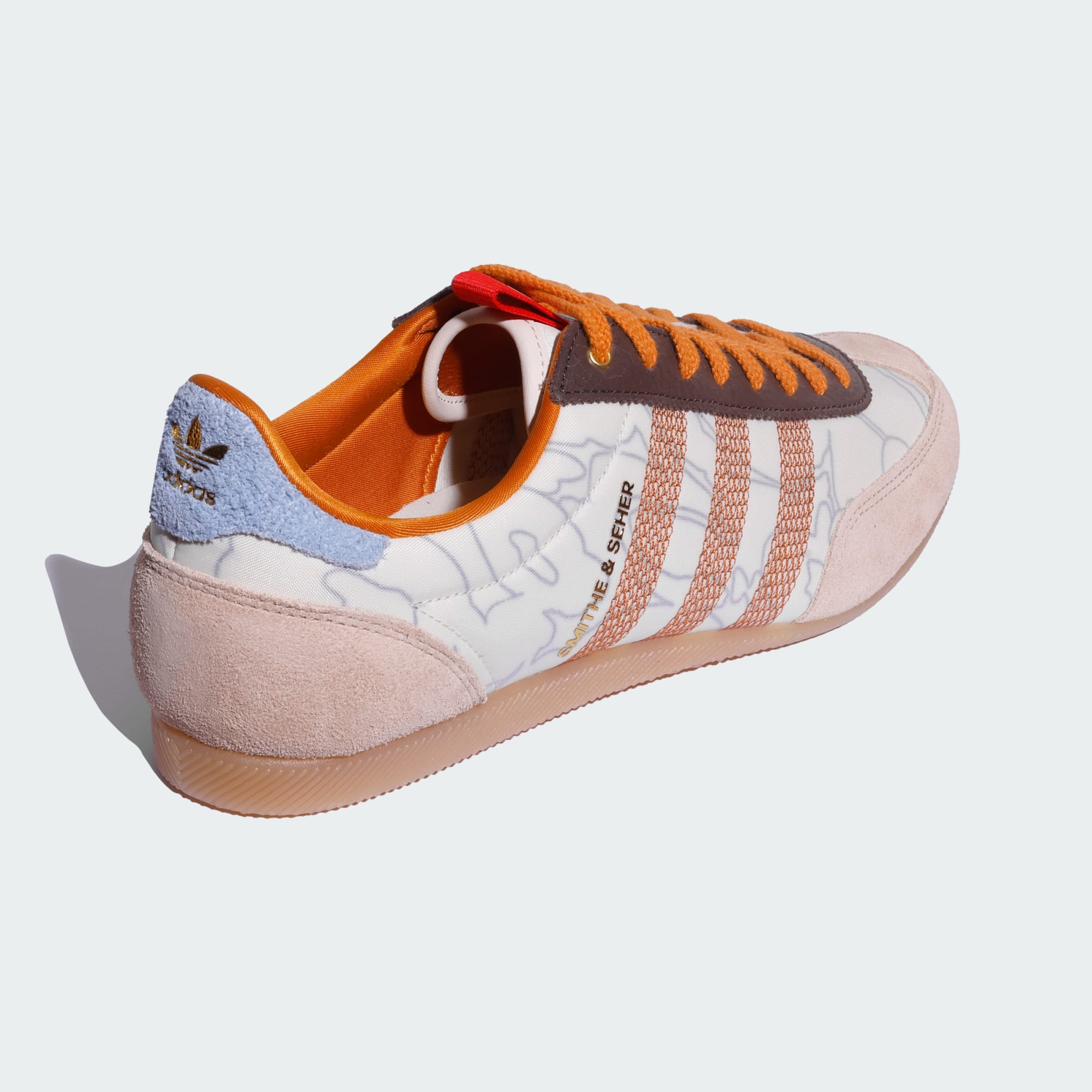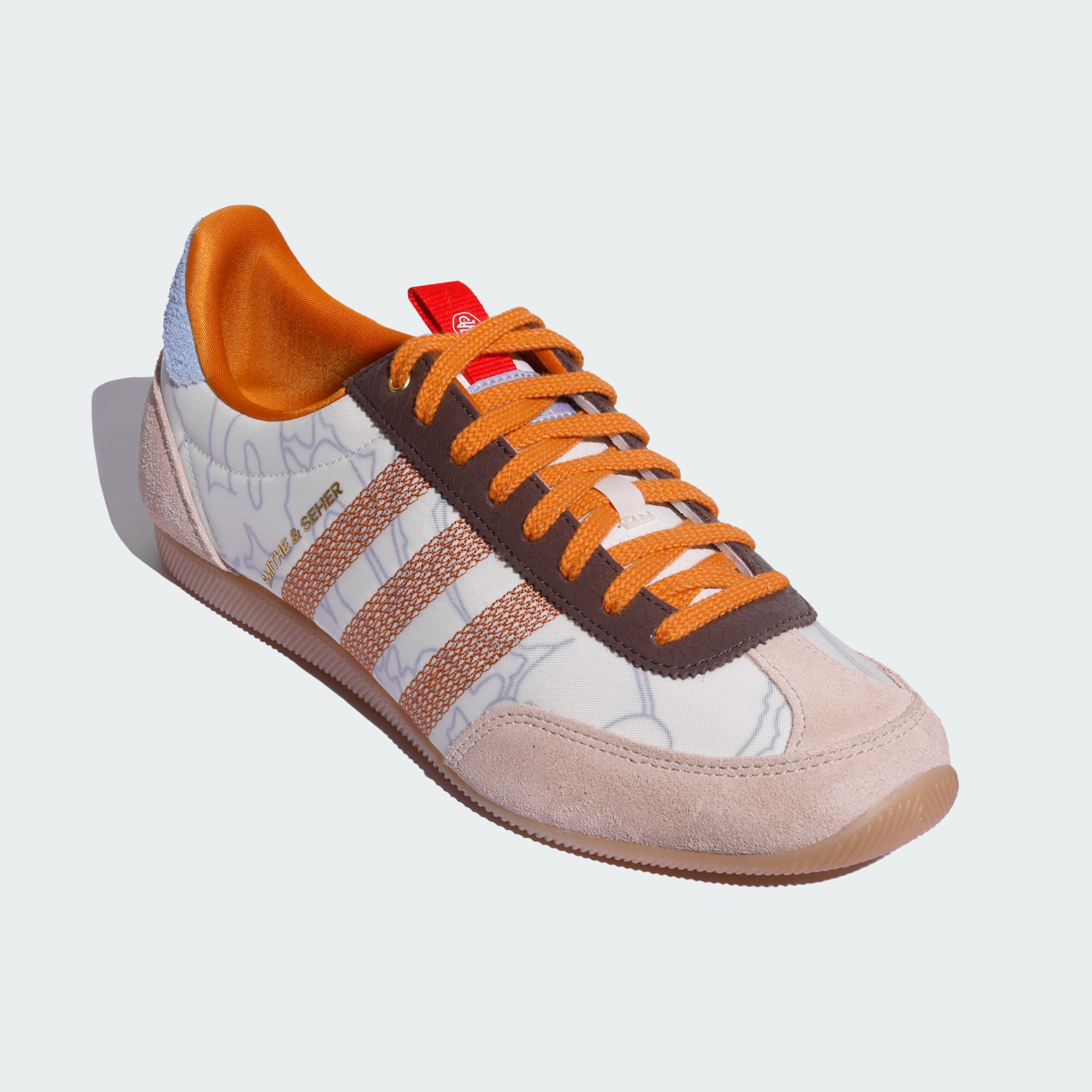 The image showcases a close-up view of a pair of Adidas Originals sneakers, featuring a vibrant orange and yellow color scheme, along with the Adidas logo and the Smithe & Seher branding prominently displayed.